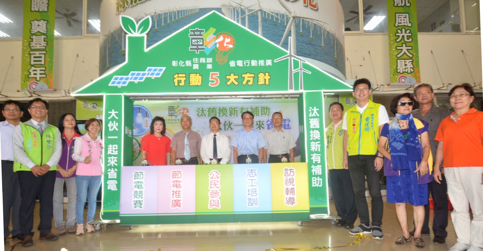 夏季為用電高峰季,為了鼓勵民眾汰舊換新老舊設備提高效能,彰化縣政府今年配合經濟部辦理全縣設備汰換補助申請,補助經費高達2.4億元,並規劃行動5大方針,幫各行各業精打細算,讓縣民「省荷包」,今(23)日上午在縣府中庭舉辦住商節電行動啟動記者會向縣民說明,彰化縣長魏明谷、經濟部能源局主秘蘇金勝等人與會,現場也請來機器人(pepper)與消費者互動說明,透過智慧科技互動聯結,來了解全縣住商辦‧農業如何加入省電行動。