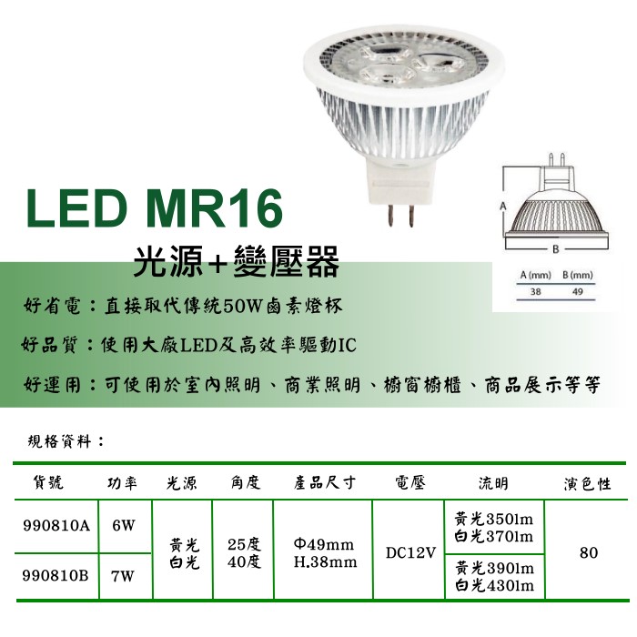 • LED MR16 6W/7W 光源+變壓器