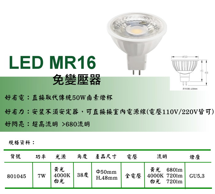 • LED MR16 7W內置變壓器