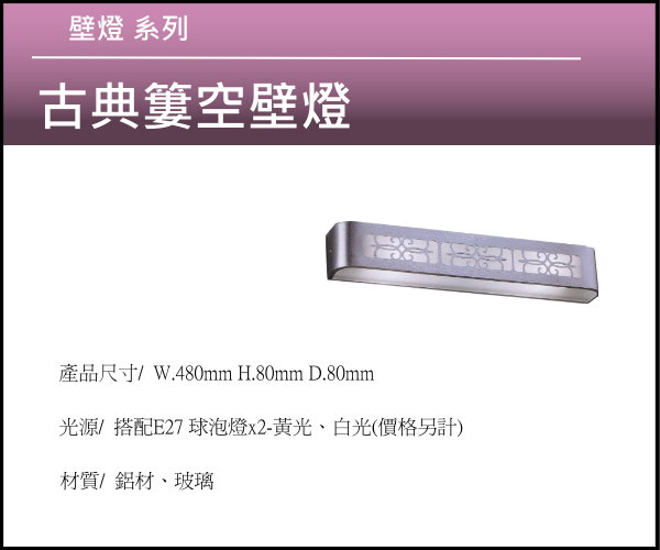 首頁 » 商品資訊 » 藝術燈飾系列 » 壁燈 » 雙燈古典簍空壁燈 燈具