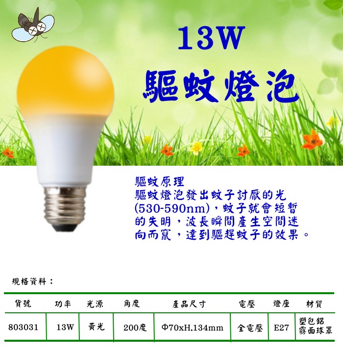 首頁 » 商品資訊 » 燈泡系列 » LED 球泡燈 » LED 13W驅蚊燈泡